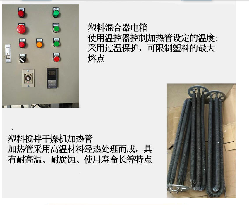 8、干燥混合功能二合一,但不需要干燥時(shí),只需將“加熱開關(guān)”及“風(fēng)機(jī)開關(guān)”關(guān)閉,本系列機(jī)型即可用于塑料攪拌均化用途,一機(jī)二用;